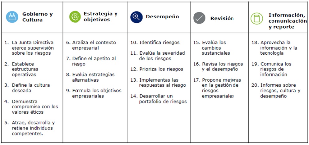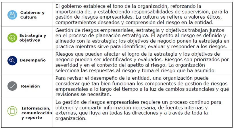 • 2017-COSO ERM, integrado con estrategia y desempeño, consta de 5 componentes y 20 principios