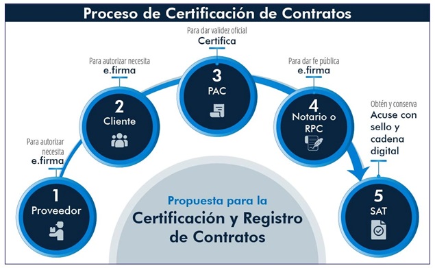 Considero que debería presentarse una iniciativa que se base en la implementación de mecanismos para que, con la intervención de un PAC tal como lo hace con un CFDI, se certifique un contrato con la e.firma de un Notario quien brinda fe pública; o bien, llevar cabo la Inscripción en el Registro Público de Comercio, en línea (ver imagen siguiente).